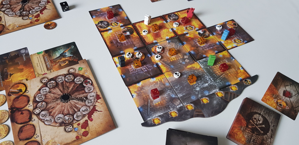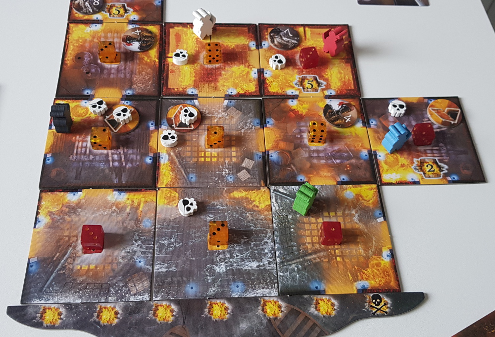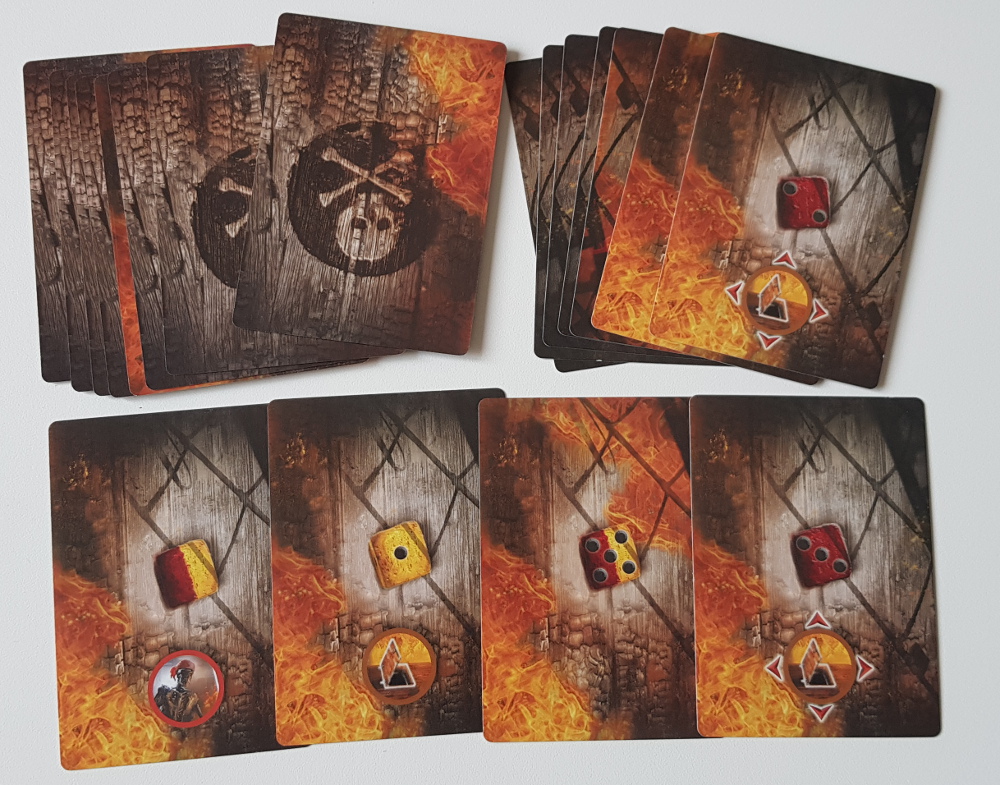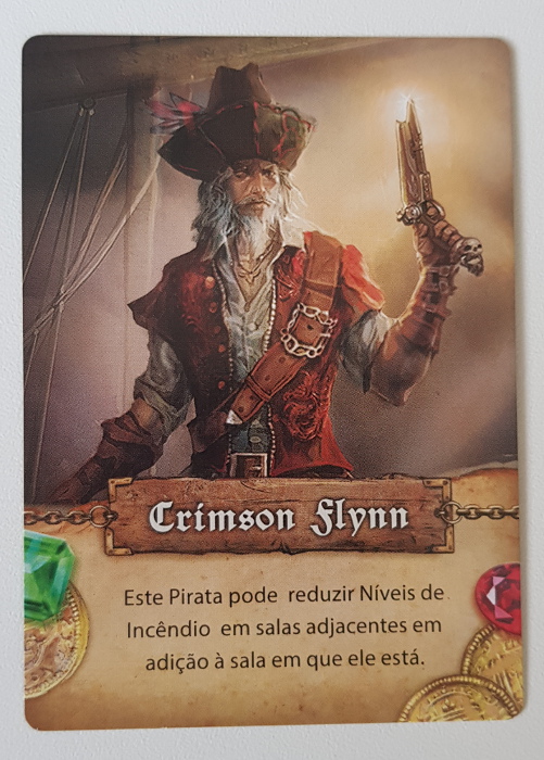 | Componentes: | 4 Tiles Iniciais e 1 Tile de Água,20 Tiles de Sala,5 Tabuleiros de Jogador com Disco de Fadiga e Trilha de Batalha,7 Meeples Piratas,30 Marcadores de Marujos,7 Marcadores de Batalhas de Personagens,24 Dados de Nível de Incêndio (12 amarelos e 12 vermelhos),26 Marcadores de Ação,1 Marcador de Explosão,1 Marcador do Capitão Fromm,20 Marcadores de Dois Lados,1 Saco de Pano,1 Dado de Batalha,39 Cartas,1 Livro de Regras |