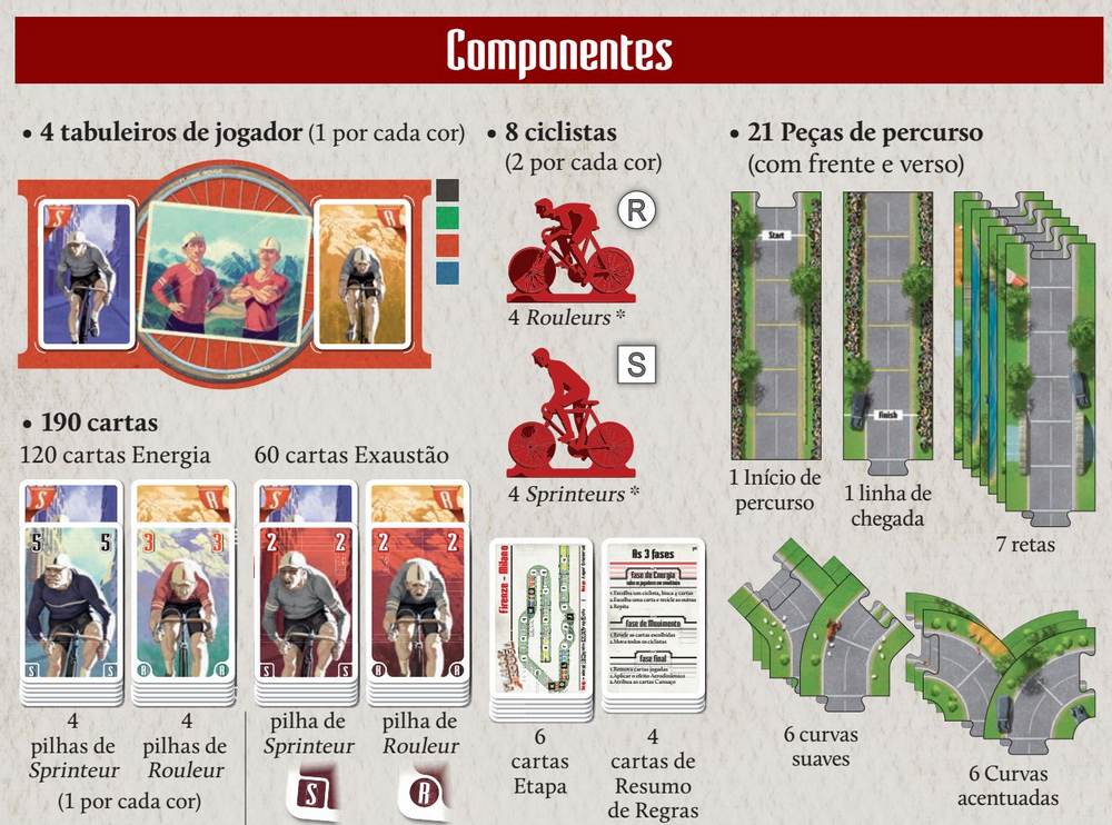 | Componentes: | 4 Tabuleiros de Jogadores, 8 Ciclistas, 21 Peças de Percurso, 190 Cartas, 1 Livro de regras, |