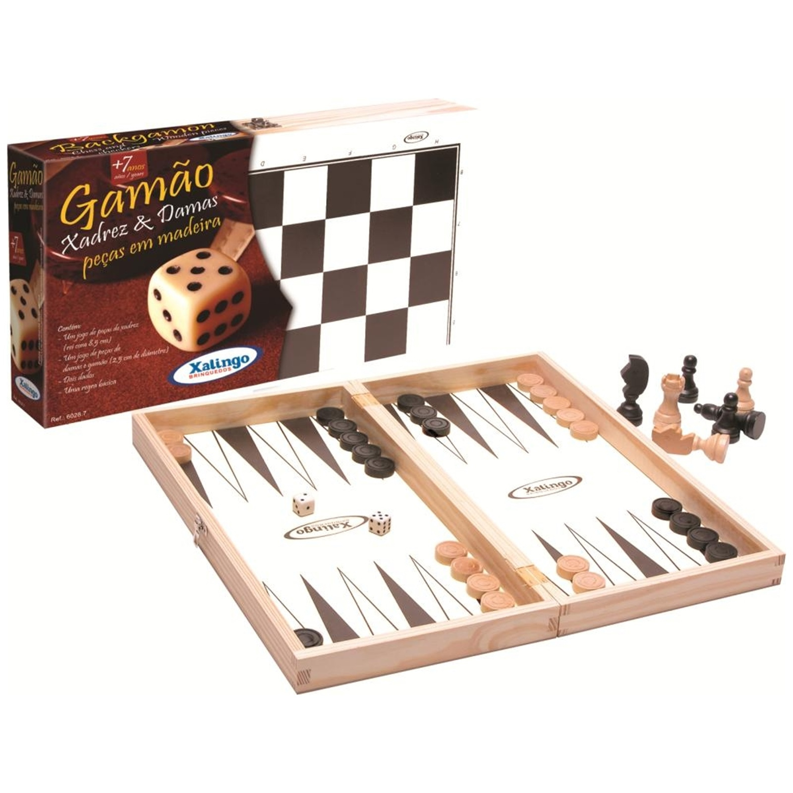 | Componentes: | 1 tabuleiro dobrável 40x40 frente e verso para 3 jogos,peças de xadrez,peças de damas e gamão, 2 dados |