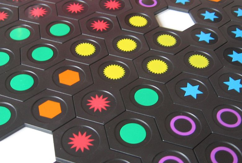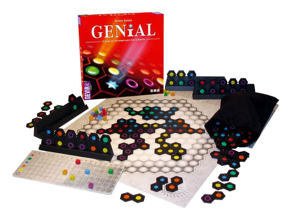 Genial é um jogo envolvente e estratégico em que o os jogadores devem colocar peças no tabuleiro para formar sequências de símbolos de mesma cor e assim pontuar. O jogo incluir o tabuleiro com os espaços para colocação das peças e também os marcadores de placar para cada jogador. O marcador de placar possui espaços para colocação de 6 cubos coloridos, correspondentes as cores em que é possível pontuar no jogo (vermelho, verde, azul, laranja e amarelo). No ínicio da partida, cada jogador recebe seis peças e em cada turno os jogadores deverão escolher uma das peças para colocar no tabuleiro. Cada peça possui dois símbolos coloridos na forma de dois hexágonos unidos por um dos lados, de forma que cada símbolo cinco dos lados estão disponíveis para fazer a ligação com outras peças do tabuleiro.