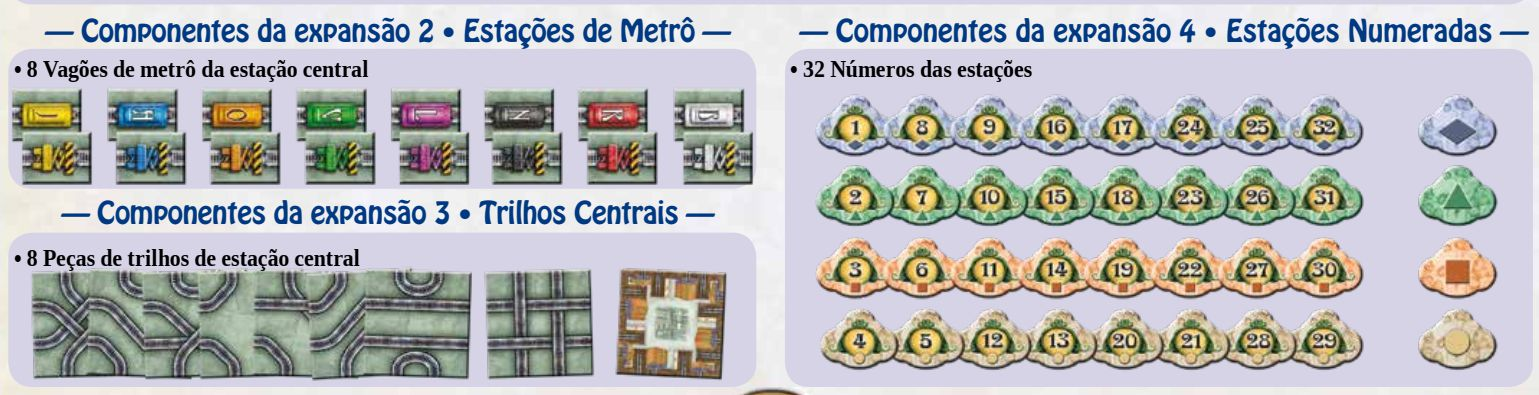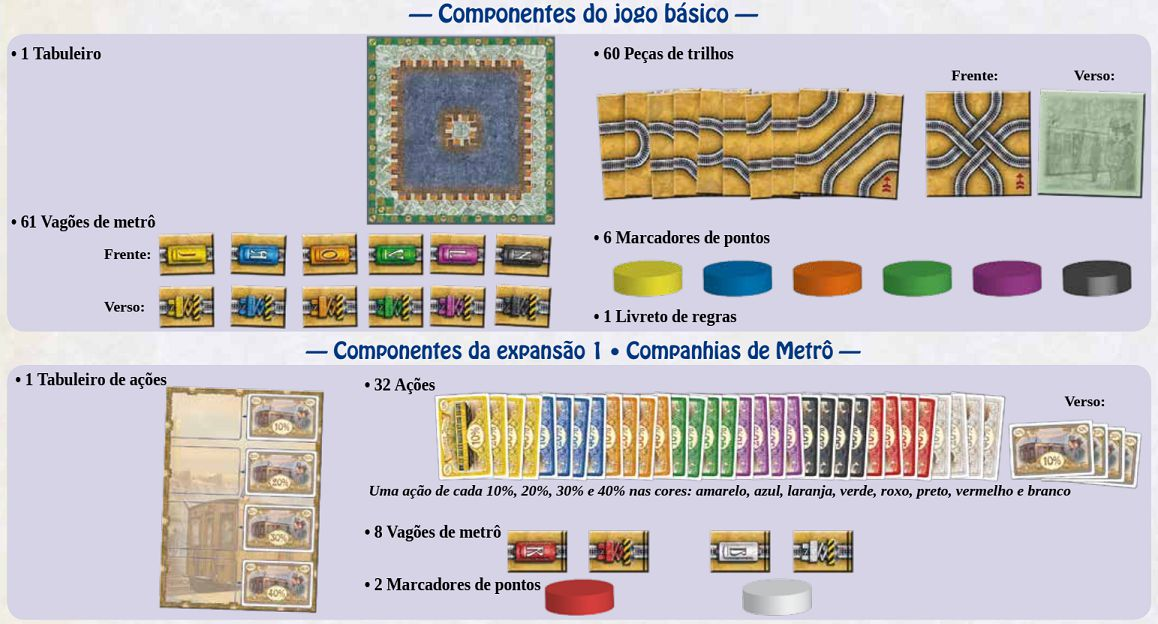 | Componentes: | 1 Tabuleiro,60 Peças de Trilhos,61 Peças de Metrô,6 Marcadores de Pontuação,1 Livreto de Regras |