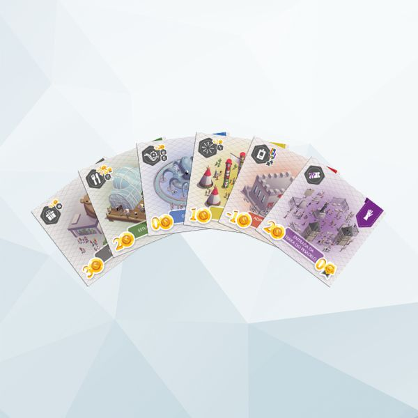 5- Passar a vez. Quando todos os jogadores tiverem passado a vez, a rodada termina. As Fichas de Compras utilizadas na compra de Construções voltam para a mão dos jogadores.