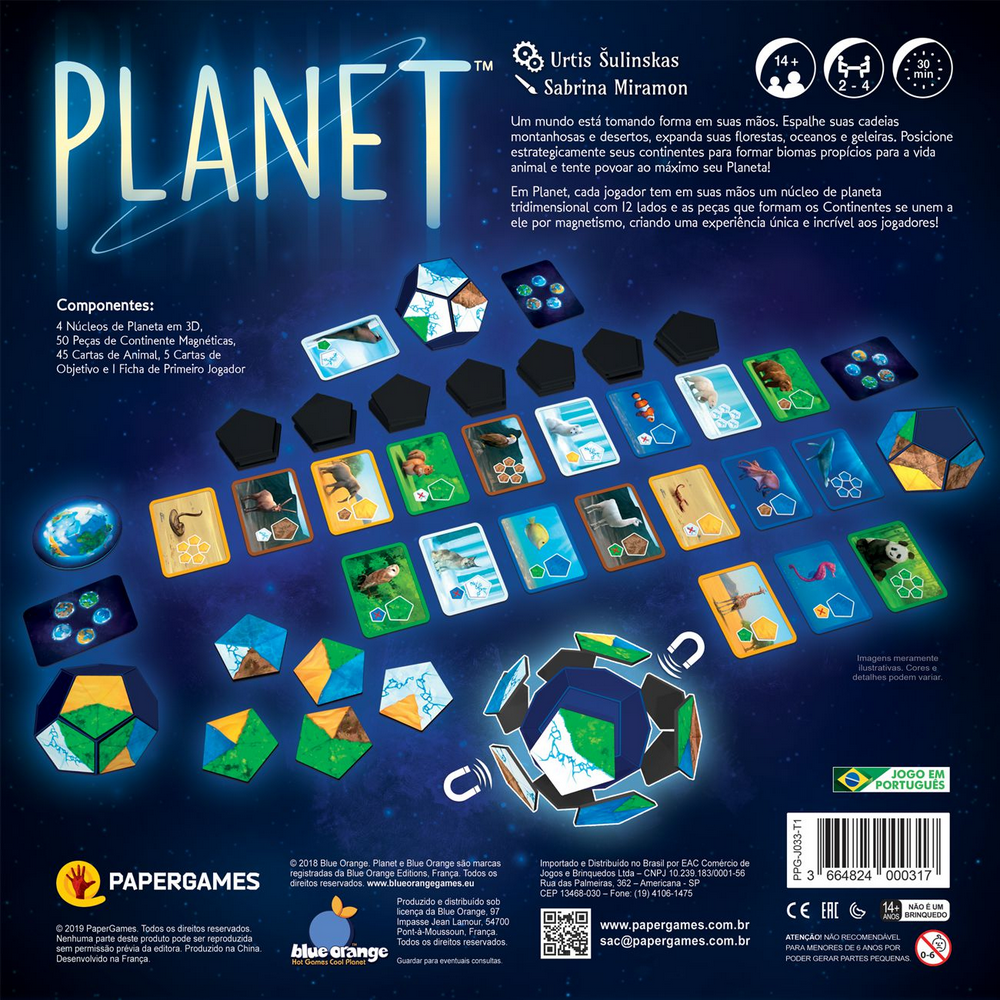 Um mundo está tomando forma em suas mãos. Espalhe suas cadeias montanhosas e desertos, expanda suas florestas, oceanos e geleiras! Nos 12 turnos que compõem uma partida de Planet, as peças de Continente serão posicionadas estratégicamente em torno do núcleo de planeta de cada jogador, aderindo magneticamente ao núcleo e formando biomas ideais para a vida animal. Os jogadores marcam pontos por completar objetivos e por povoar seu Planeta com o máximo de animais possíveis! Planet é um jogo para 2 a 4 jogadores, recomendado a partir de 8 anos e com duração média de 30 minutos. No Brasil, é publicado pela editora Papergames. Consulte o manual para detalhamento completo das regras do jogo.