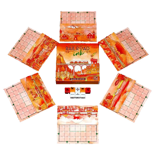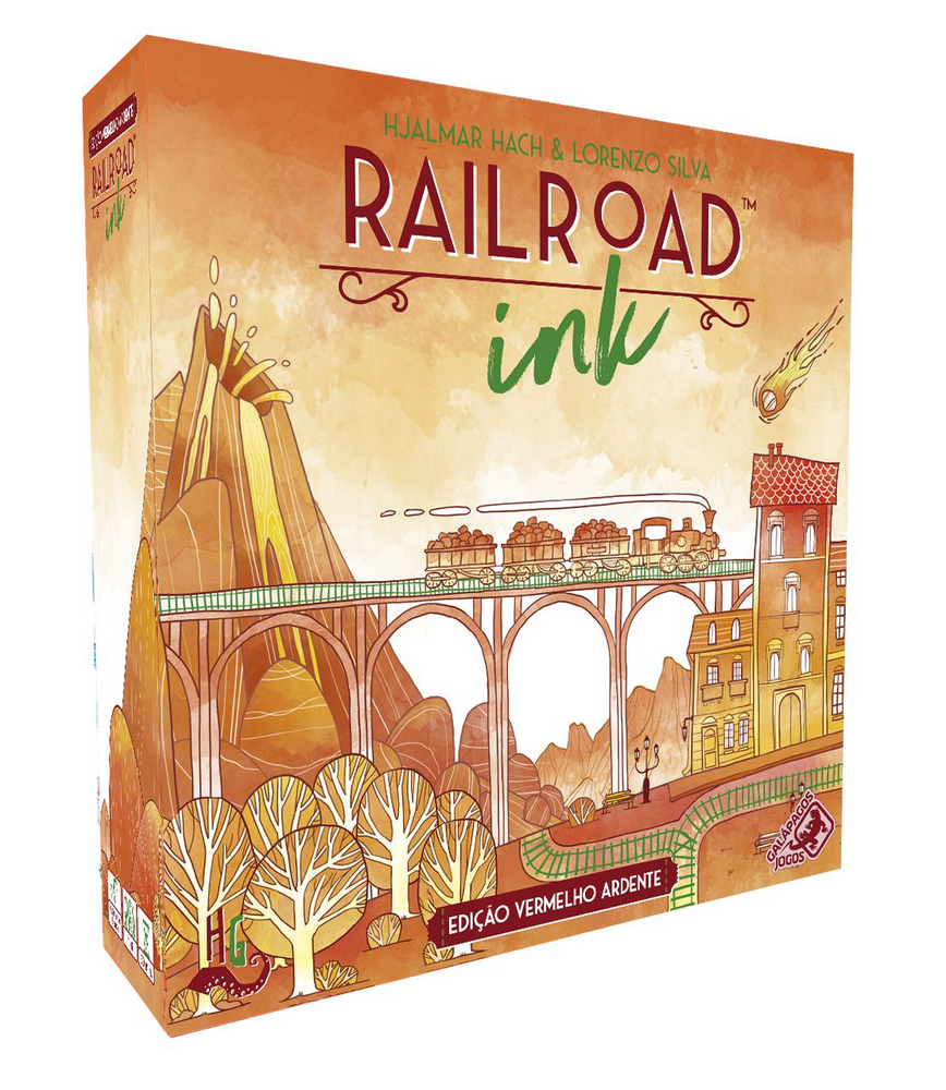 Em Railroad Ink™, Role os dados e escolha com estratégia onde desenhar para criar a Rota com a maior pontuação. Uma partida de Railroad Ink é jogada em 7 rodadas. A cada rodada, um jogador lança os dados que mostram trechos de Rotas em diferentes formatos, e todos devem desenhar em seus tabuleiros as faces mostradas nos dados. O Tabuleiro possui saídas marcadas e o objetivo é conectar o máximo possível de Saídas umas às outras, usando a criatividade para criar Redes. Quanto mais Saídas cada jogador conectar à mesma Rede, mais pontos ele ganhará no fim da partida. Os jogadores também também pode ganhar pontos bônus pela sua Ferrovia Mais Longa, Estrada Mais Longa e desenhando nos Espaços Centrais do seu Tabuleiro. A edição Vermelha inclui as expansões Vulcão e Meteoro, que adicionam algumas regras ao jogo deixando-o ainda mais desafiador! Railroad Ink Edição Vermelho Ardente é um jogo para 1 a 6 jogadores, recomendado a partir de 8 anos e com duração média de 20 minutos. No Brasil, é publicado pela editora Galapagos. Consulte o manual para detalhamento completo das regras do jogo.