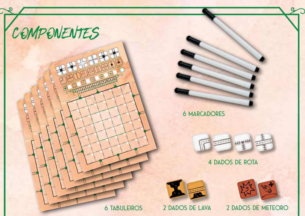 | Componentes: | 6 Tabuleiros,6 Marcadores,4 Dados de Rota,2 Dados de Rio,2 Dados de Lago,1 Livro de regras |