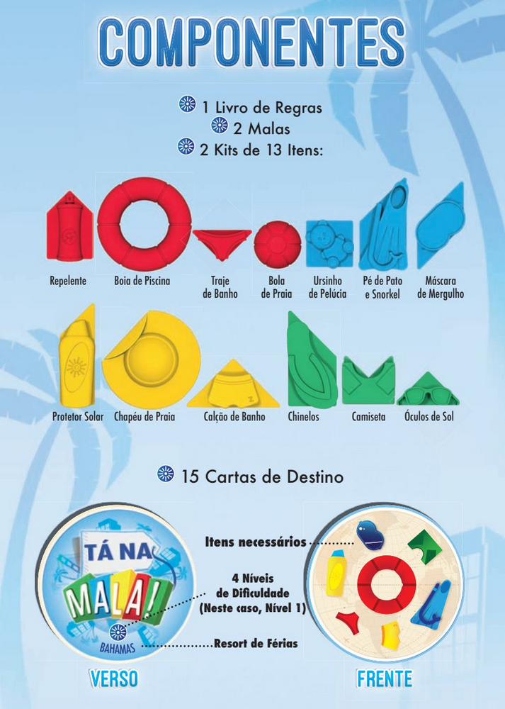 | Componentes: | 2 Malas de plástico,26 Itens de plástico,15 Cartas de destino,1 Folheto de regras |
