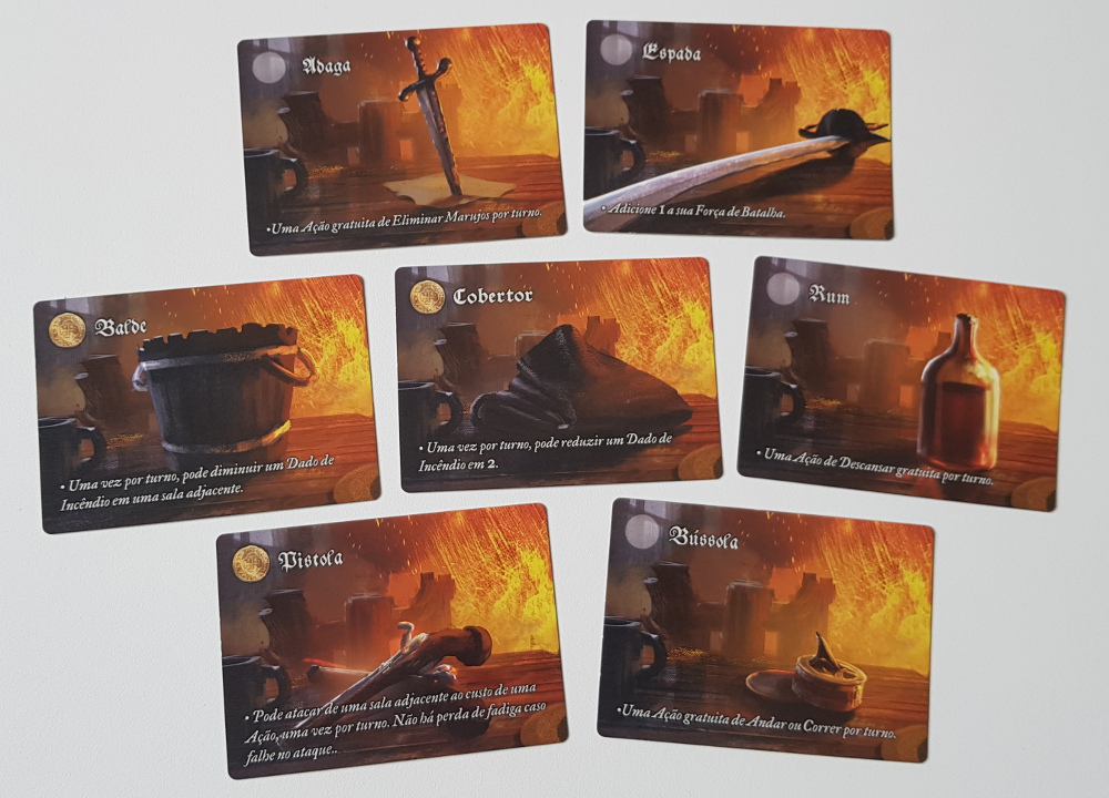 | Componentes: | 4 Tiles Iniciais e 1 Tile de Água,20 Tiles de Sala,5 Tabuleiros de Jogador com Disco de Fadiga e Trilha de Batalha,7 Meeples Piratas,30 Marcadores de Marujos,7 Marcadores de Batalhas de Personagens,24 Dados de Nível de Incêndio (12 amarelos e 12 vermelhos),26 Marcadores de Ação,1 Marcador de Explosão,1 Marcador do Capitão Fromm,20 Marcadores de Dois Lados,1 Saco de Pano,1 Dado de Batalha,39 Cartas,1 Livro de Regras |
