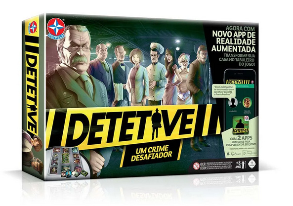 "Detetive" é um jogo de tabuleiro em que os jogadores serão investigadores do assassinato do milionário Carlos Fortuna. Os jogadores percorrerão os locais do tabuleiro e tentarão descobrir o assassino, o local do crime, e a arma do crime. Quando foi inicialmente lançado no Inglaterra, o jogo recebeu o nome de "Cluedo", enquanto nos Estados Unidos o jogo recebeu o nome de "Clue". O jogo foi criado por Anthony Ernest Pratt, na Inglaterra, em 1943. Anthony era pianista e na época trabalhava em um escritório de advocacia. Detetive é um jogo inspirado nos romances policiais ingleses e acredita-se Anthony o tenha criado porque não conseguia se conformar com o fato de que a Segunda Guerra Mundial estava "acabando com a vida social" do seu país. No Brasil, o jogo foi lançado pela Estrela em 1977, recebendo o nome de "Detetive". Na versão tradicional, os personagens do jogo receberam as traduções dos nomes originais ingleses, que fazem referência à cores, e que se tornaram clássicos para os jogadores: Coronel Mostarda, Dona Branca, Dona Violeta, Professor Black, Sr. Marinho e Srta. Rosa. Os locais do crime no jogo original eram os aposentos de uma mansão, e o jogo incluia as miniaturas de armas como corda, revólver, candelabro, chave inglesa, faca, cano e soco inglês, que eram distribuídas pelos aposentos no tabuleiro do jogo. Atualmente o jogo é publicado no Brasil pela Estrela e mundialmente pela Hasbro (no Brasil é possível encontrar as versões "Detetive" e "Clue", já que houve um acordo da Estrela com a Hasbro para comercialização de ambas as versões no país). Desde a sua criação, já foram lançadas diferentes edições e versões de "Detetive", incluindo mudanças na estória, nos locais e nos personagens. A versão do jogo comentada abaixo em nosso review se passa em uma cidade e traz a possibilidade de se jogar utilizando um aplicativo, com dois modos de jogo, e ainda utilizar realidade aumentada (ainda é possível jogar apenas com o tabuleiro, da maneira tradicional). Detetive (com app) é um jogo para 3 a 8 jogadores, recomendado a partir de 8 anos e com duração média de 60 minutos. No Brasil, é publicado pela editora Estrela. Consulte o manual para detalhamento completo das regras do jogo.