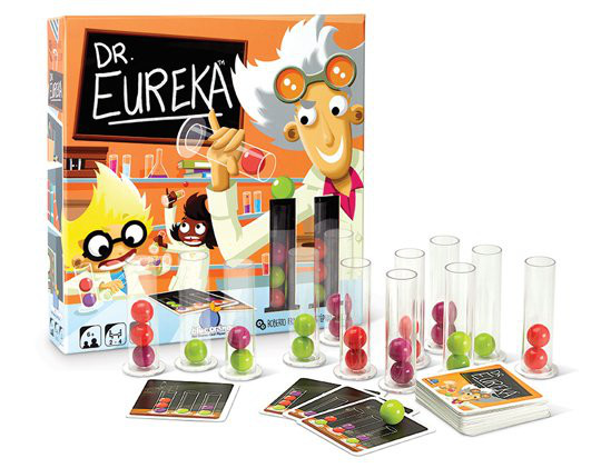 Em Dr. Eureka cada jogador recebe 3 tubos de ensaio. Cada tubo contém duas bolas coloridas, sendo 2 bolas verdes, 2 bolas vermelhas e 2 bolas roxas. Em cada turno é revelada uma carta desafio e colocada no centro da mesa. A Carta Desafio contém uma imagem mostrando uma sequência dos três tubos com bolas coloridas dentro. A missão dos jogadores é replicar exatamente a figura da carta de desafio, e para tal, os jogadores devem transferir as bolas de uns tubos para os outros, sem tocar nas bolas com as mãos e sem as deixar cair. O primeiro jogador a obter a combinação certa das bolas nos tubos de ensaio grita "Eureka!". Se os outros jogadores concordarem que o arranjo está certo, este jogador ganha a Carta Desafio, que vale 1 ponto. O primeiro jogador a atingir 5 pontos (5 cartas de Desafio) é o vencedor.Dr. Eureka é um jogo divertido que estimula a observação e o raciocínio de crianças e adultos. Dr Eureka é um jogo para 2 a 4 jogadores, recomendado a partir de 6 anos e com duração média de 15 minutos. No Brasil, é publicado pela editora Mandala. Consulte o manual para detalhamento completo das regras do jogo.