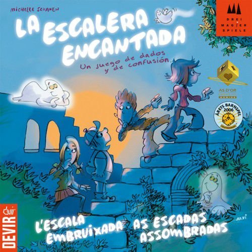 Em "Escadas Assombradas" cada jogador em seu turno lançará o dado. Se o resultado for um número, o jogador move seu peão pelas escadas tantos degraus quantos forem os pontos mostrados nos dados. Porém se o resultado do dado for a figura de um fantasma, então o jogador que lançou o dado deve transformar em fantasma um peão à sua escolha (seu ou de outro jogador). Para isso, este jogador coloca um dos fantasmas que estão ao lado do tabuleiro sobre um dos peões. A cabeça do peão possui um imã e o fantasma irá cobrir o peão, fazendo-o desaparecer! Os fantasmas de movimentam de acordo com o resultado dos dados da mesma forma que os peões, porém os jogadores devem ficar atentos para lembrar qual é o seu peão, sob o risco de movimentar o peão incorreto. Para tornar tudo mais desafiador, se todos os peões já foram transformados em fantasmas e sai um fantasma no dado, o jogador que o lançou deve trocar dois fantasmas de posição! Quando um fantasma chega ao último degrau (onde se encontra o velho fantasma), o jogo termina e vence o jogador cujo peão se esconde sob esse fantasma. Escadas Assombradas é um divertido jogo que irá exercitar a memória e a atenção das crianças. Escadas Assombradas é um jogo para 2 a 4 jogadores, recomendado a partir de 4 anos e com duração média de 15 minutos. No Brasil, é publicado pela editora Devir. Consulte o manual para detalhamento completo das regras do jogo.