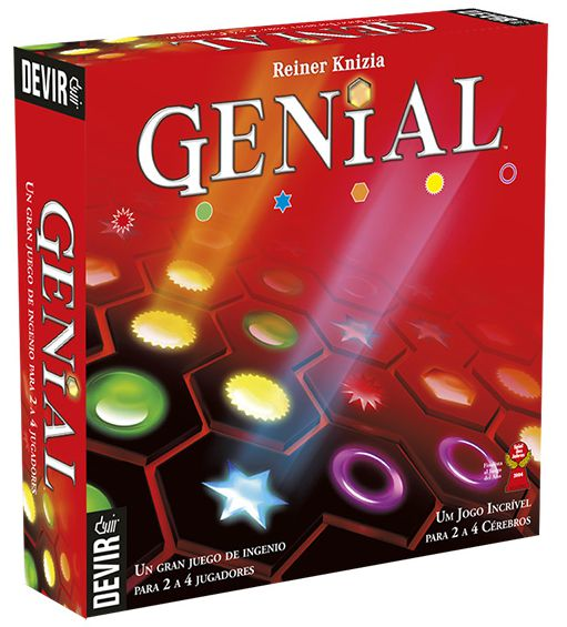 Genial é um jogo envolvente e estratégico em que o os jogadores devem colocar peças no tabuleiro para formar sequências de símbolos de mesma cor e assim pontuar. O jogo incluir o tabuleiro com os espaços para colocação das peças e também os marcadores de placar para cada jogador. O marcador de placar possui espaços para colocação de 6 cubos coloridos, correspondentes as cores em que é possível pontuar no jogo (vermelho, verde, azul, laranja e amarelo). No ínicio da partida, cada jogador recebe seis peças e em cada turno os jogadores deverão escolher uma das peças para colocar no tabuleiro. Cada peça possui dois símbolos coloridos na forma de dois hexágonos unidos por um dos lados, de forma que cada símbolo cinco dos lados estão disponíveis para fazer a ligação com outras peças do tabuleiro.