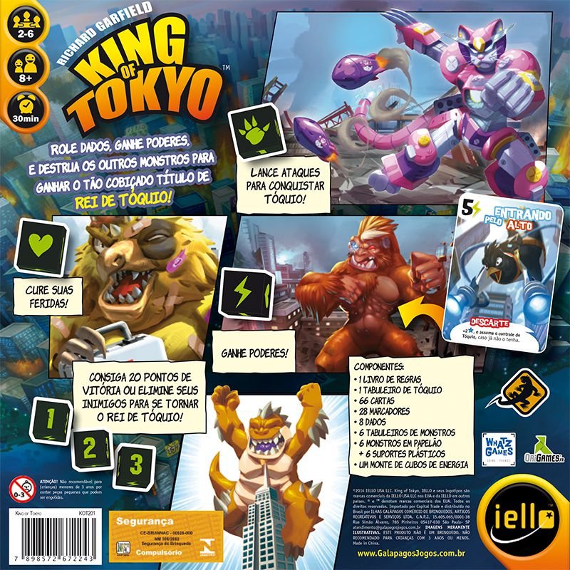 | Componentes: | 1 Livro de Regras, 1 Tabuleiro de Tokyo, 66 Cartas, 28 Contadores, 8 Dados, 6 Monstros, 6 Bases de Plástico, |
