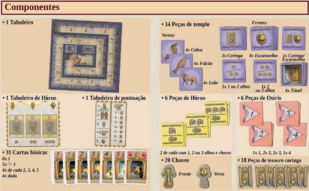 | Componentes: | 1 Tabuleiro,1 Tabuleiro de Hórus,1 Tabuleiro de Pontuação,31 Cartas Básicas,24 Cartas de Hórus,30 Peças de Tesouro,14 Peças de Templo,6 Peças de Hórus,6 Peças de Osíris,20 Chaves,18 Peças de Tesouro Coringa,22 Escaravelhos,2 Sarcófagos,4 Marcadores de Jogador,4 Marcadores de Pontos,1 Dado,1 Marcador de 1º Jogador,1 Livreto de Regras |