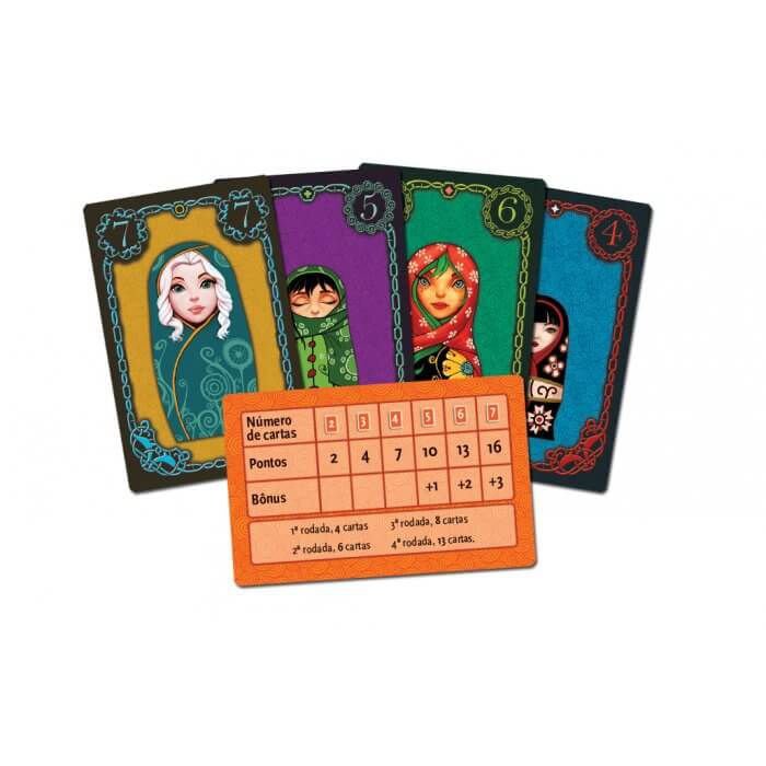 Matryoshka é um interessante jogo de cartas que contém 10 conjuntos de 7 cartas de Matryoska (70 cartas no total). O objetivo de cada jogador é conseguir coleções de Matrioskas que garantam o maior número de pontos ao final do jogo. Em cada turno, o jogador ativo deverá comprar cartas para compor a sua mão de jogo e escolher uma carta para oferecer para troca com outro jogador. Os demais jogadores também oferecerão uma carta para troca mas somente a carta do jogador ativo será visível para todos. Durante a partida cada jogador baixará na sua frente um conjunto de cartas das diferentes Matryoskas conseguidas, organizadas por cor e tamanho. O jogo terminará na quarta rodada quando cada jogador tiver exatamente 13 cartas de Matryoskas na sua frente. Os pontos são concedidos para grupos de Matryoskas de mesmo tamanho e também para coleções de Matryoskas de mesma cor. O jogador que conseguir o maior número de pontos é o vencedor. Matryoshka é um jogo para 3 a 5 jogadores, recomendado a partir de 14 anos e com duração média de 20 minutos. No Brasil, é publicado pela editora Mandala. Consulte o manual para detalhamento completo das regras do jogo.