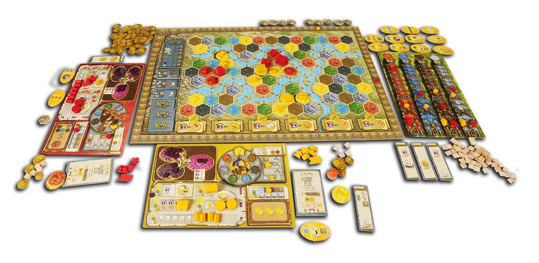 | Componentes: | 1 Tabuleiro, 1 Tabuleiro de Culto, 7 Cartões de Facção de Dupla-Face, Por cor de Facção Verde, Amarelo, Azul, Marrom, Vermelho, Preto, Cinza (8 Habitações, 4 Casas de Comércio, 1 Fortaleza, 3 Templos, 1 Santuário, 7 Clérigos, 7 Marcadores, 3 Pontes), 56 Fichas de Terreno Dupla-Face, 65 Trabalhadores de Cor Neutra, 40 Moedas Pequenas (Valor 1), |