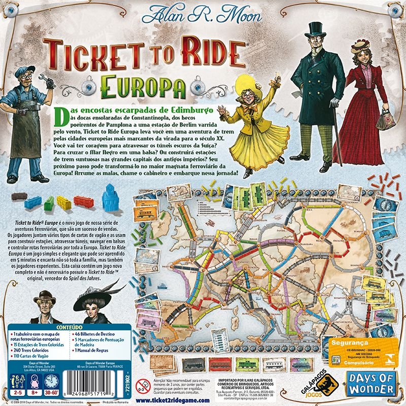 Ticket to Ride® Europa é mais um capítulo da série de aventuras ferroviárias que é um sucesso de vendas. Nele os jogadores juntam vários tipos de cartas de vagão e as usam para construir estações, atravessar túneis, navegar em balsas e controlar rotas ferroviárias por toda a Europa. Ticket to Ride Europa é um jogo simples e elegante que pode ser aprendido em 5 minutos e encanta não só toda a família, mas também os jogadores experientes.